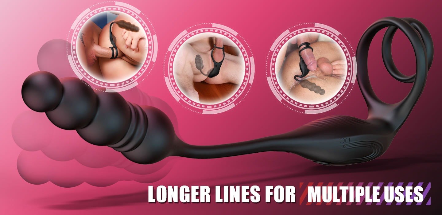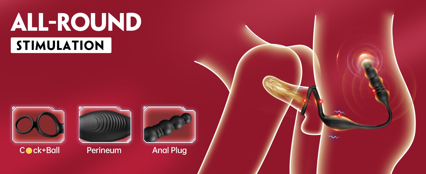 4 in 1 - Double Penis Ring + Prostate Massager + Anal Plug: This sex toy consists of a vibrating double cock ring, perineum, a prostate massager and anal beads, you can use these functions simultaneously or separately, it provides you with a variety of modes, and can unlock a variety of sexual positions and sensations.